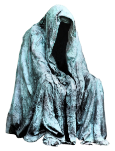 Death walking out of the ocean… A hooded figure carrying a skeleton…gliding out of the sea, walking out of the waves… Here was, I began to think, a counter-part to the earlier white mourning of the Lemurian sisters… Here was a dark gray hooded figure carrying a skeleton out of the waves under a clouded sky.